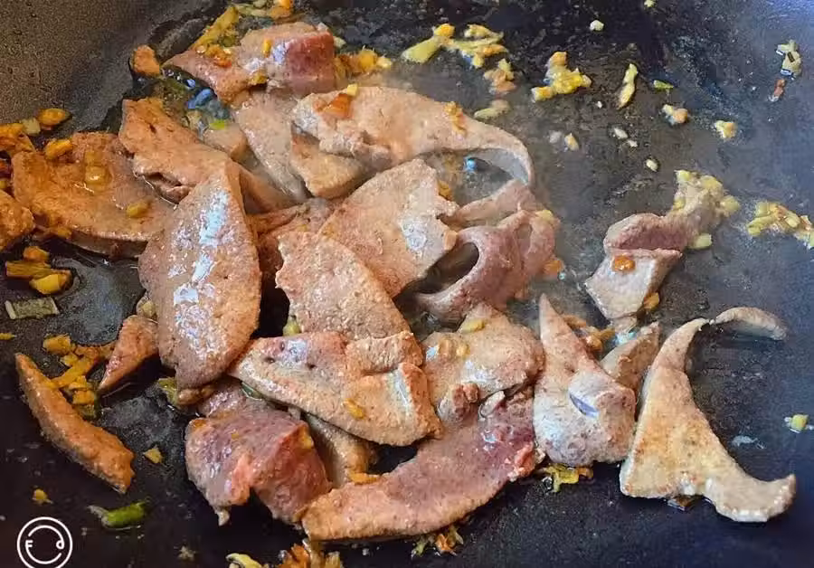 第四步:將瀝干水的豬肝放入鍋中,快速翻炒至斷生,加一點點生抽提味提色,接下來是重點哦,加入沸騰的開水,然後將枸杞放入。