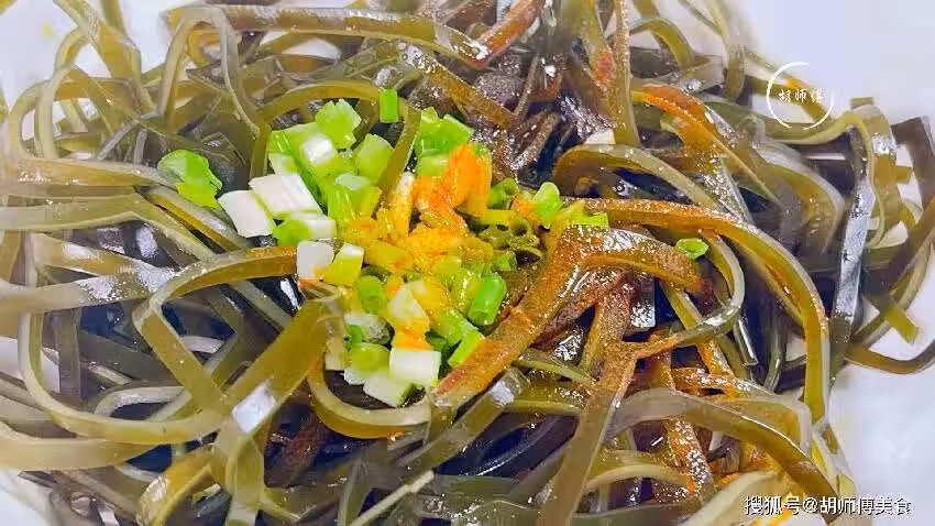 第三步:將生抽、陳醋、雞精、辣椒油、十三香、食鹽、香油、蔥花全部放入到海帶中攪拌均勻,然後腌制15分鐘,這樣能使海帶絲更入味。