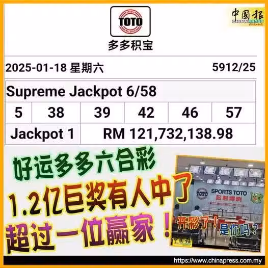 (吉隆坡18日訊)大馬史上最大筆獎金今晚名花有主,好運多多六合彩(6/58)開彩,至少5名幸運兒共享逾1億2000萬令吉!