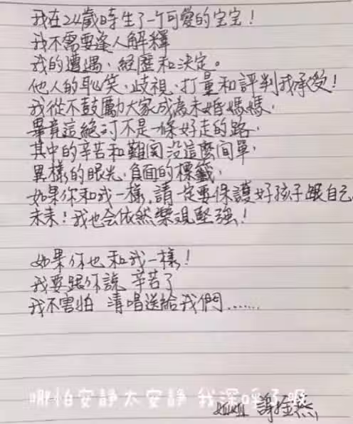 謝金燕表示不鼓勵大家成為未婚媽媽,這不是一條好走的路,辛苦和難關沒這麼簡單,會保護好孩子及自己的未來,會依然樂觀堅強,還鼓勵單親媽媽,想唱一首《我不害怕》送給她們。
