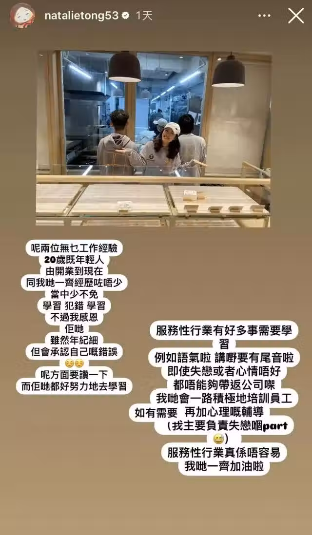 對於網友的熱議,唐詩詠都有發文回應,她指這兩位沒什麼工作經驗的20歲年輕人,從開業到現在同大家一起經歷了很多,當時少不免學習犯錯學習,不過自己也很感恩他們,年紀雖小但會承認自己的錯誤,而他們也真的需要好好去學習。