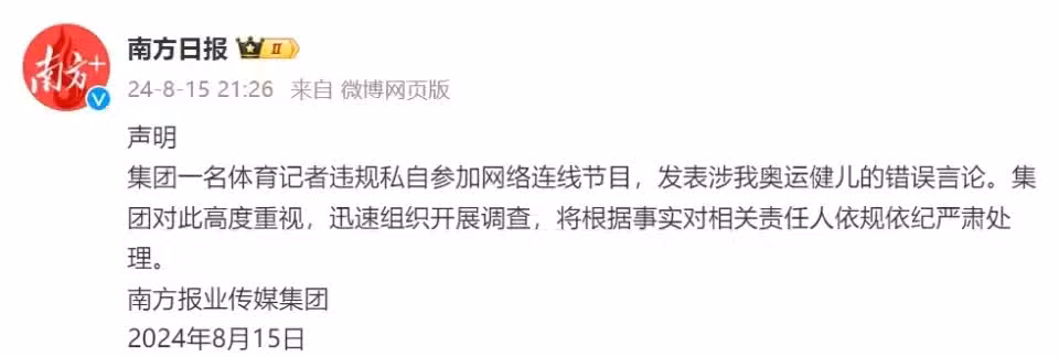 南方日報就集團記者朱小龍在網絡直播中的言論發表聲明,將根據事實對相關責任人依規依紀嚴肅處理。那麼南方報業記者引發了什麼爭議呢?他在直播中談到全紅嬋,說她瘋瘋癲癲地給德國運動員展示金牌。不可能跳一輩子水吧,不跳水以後,像個白痴一樣,能行嗎?