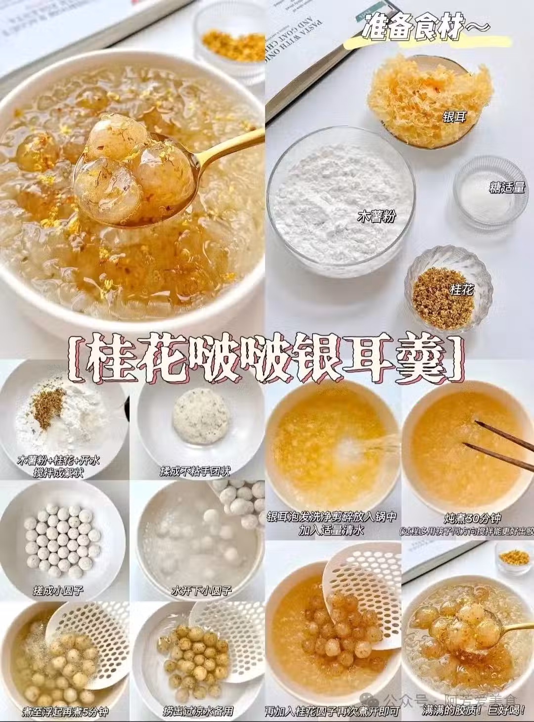 掛花啵啵銀耳羹,這款簡直是最愛!桂花香真的讓人忍不住想一直聞。和銀耳搭配多了一絲色彩,色香味俱全!桂花丸子簡直是打開味蕾。