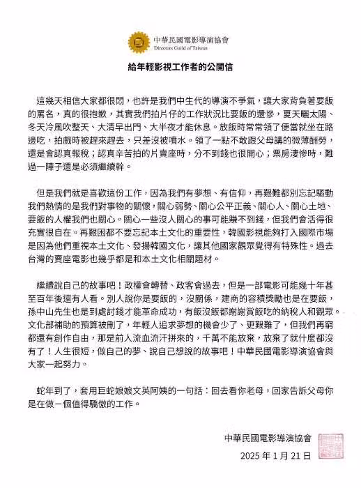 最近的低迷氣氛可能讓許多人感到悶悶不樂,「也許是我們中生代的導演不爭氣,讓大家背負著要飯的罵名,真的很抱歉,其實我們拍片仔的工作狀況比要飯的還慘,夏天曬太陽、冬天冷風吹整天、大清早出門、大半夜才能休息。」儘管如此,這些電影人依然對工作充滿熱情和夢想,無論拍片賣座與否,依然會感到滿足,因為他們關心的不僅是票房,更是社會的公平正義、弱勢群體、人權等議題。