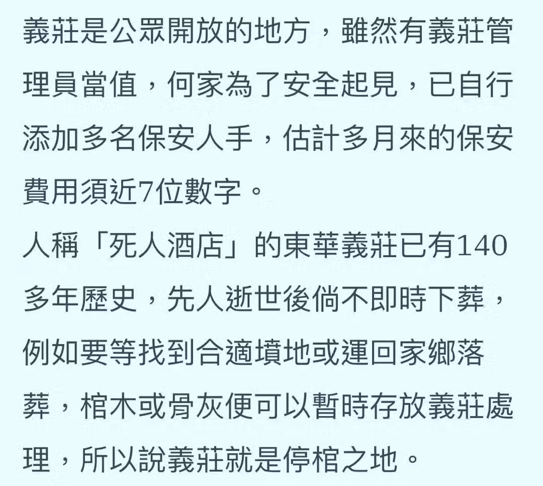 何家完全可以找到一個更好的地方安置賭王遺體,卻最終選擇「義莊」,還為此出錢聘請多名保安。
