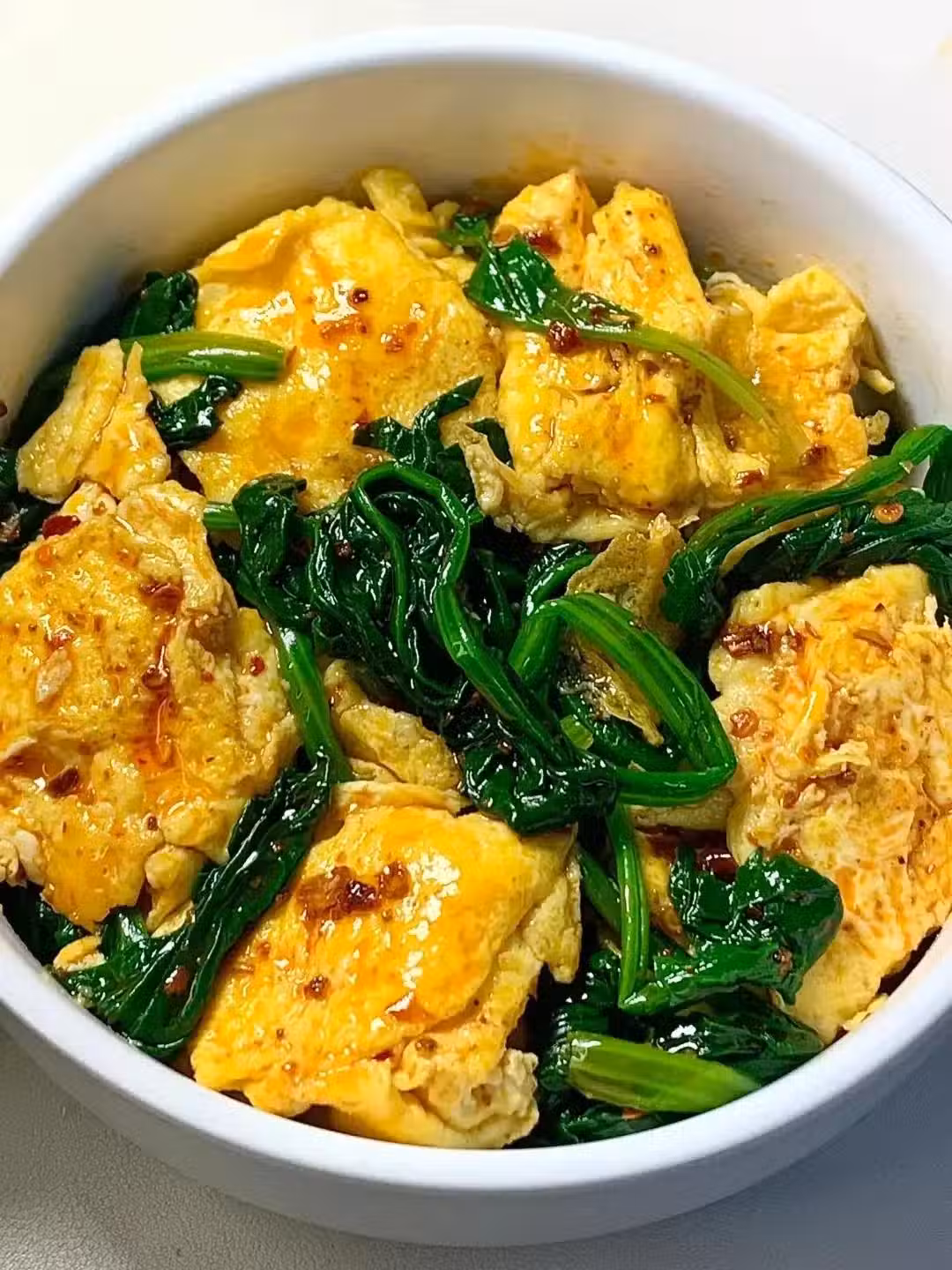 2.鍋中少油,放入雞蛋炒熟,再放入菠菜翻炒均勻,加一勺豆瓣醬,翻炒均勻即可出鍋