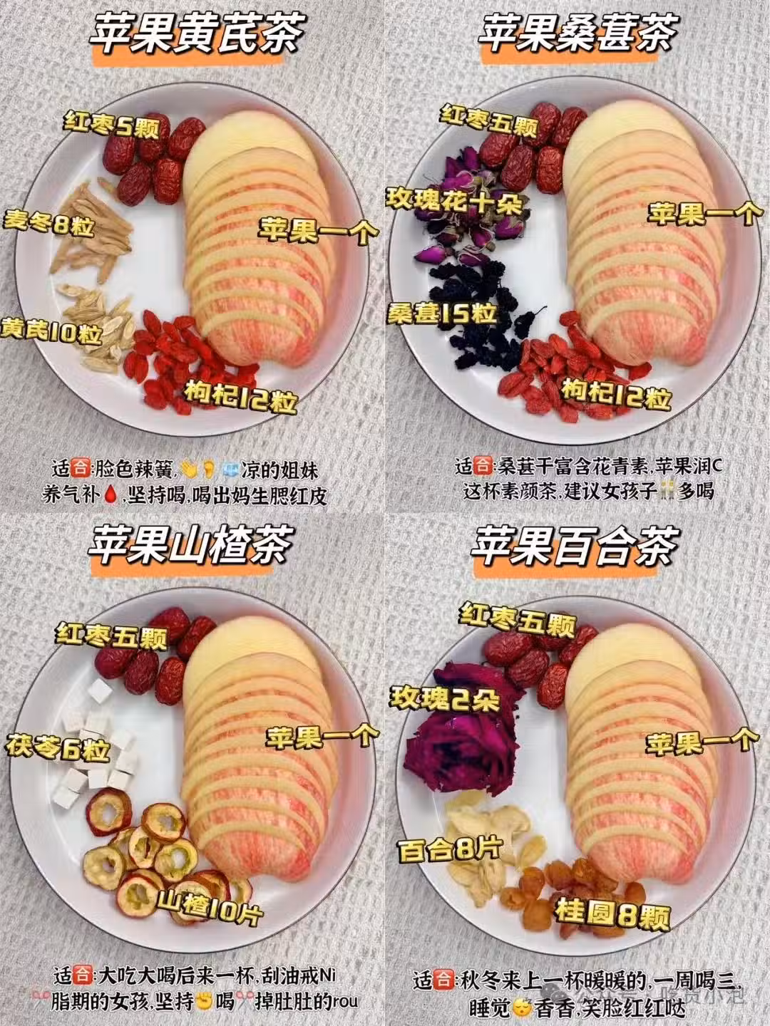 1. 蘋果+黃芪+紅棗+麥冬+枸杞:補氣養血。