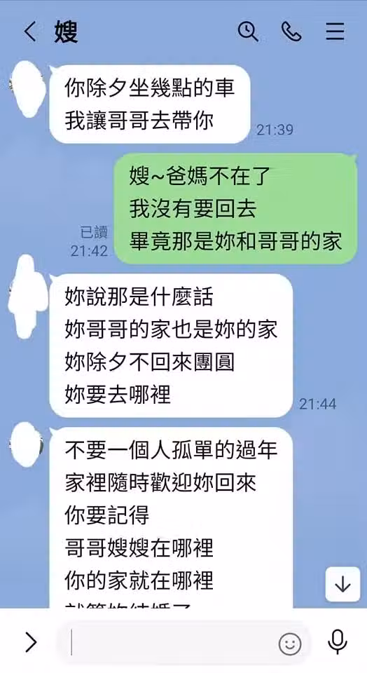 嫂嫂的一番話讓原PO既感動又愧疚,連忙向嫂嫂道歉,嫂嫂也暖心回覆:「爸媽都不在了,你又沒結婚,我們不保護你,誰來保護你?」並再次叮嚀「記得回來團圓」!初一時嫂嫂還打電話回娘家,請媽媽多整理出一間房:「我帶我小姑回去,要不然只有她一個人在家而已。」聽到這些話,原PO眼淚根本止不住,直呼:「我前世一定是超級大善人,或者救了全宇宙,才有那麼好的嫂嫂!」