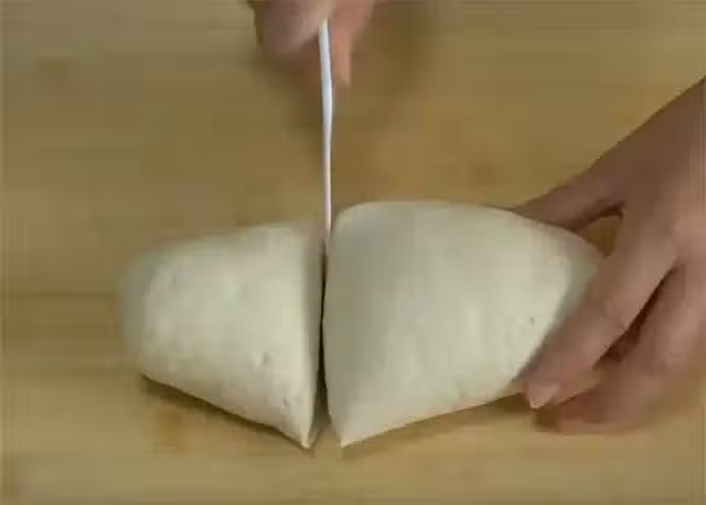 2.接下來準備一個大碗,裡面放350克麵粉,把剛才準備好的溫牛奶酵母水一點點倒進去,邊倒邊用筷子攪,攪成絮狀後,就用手開始揉吧,揉成一個光滑的麵糰,然後直接搓成長條,分成一大一小兩個麵糰備用。