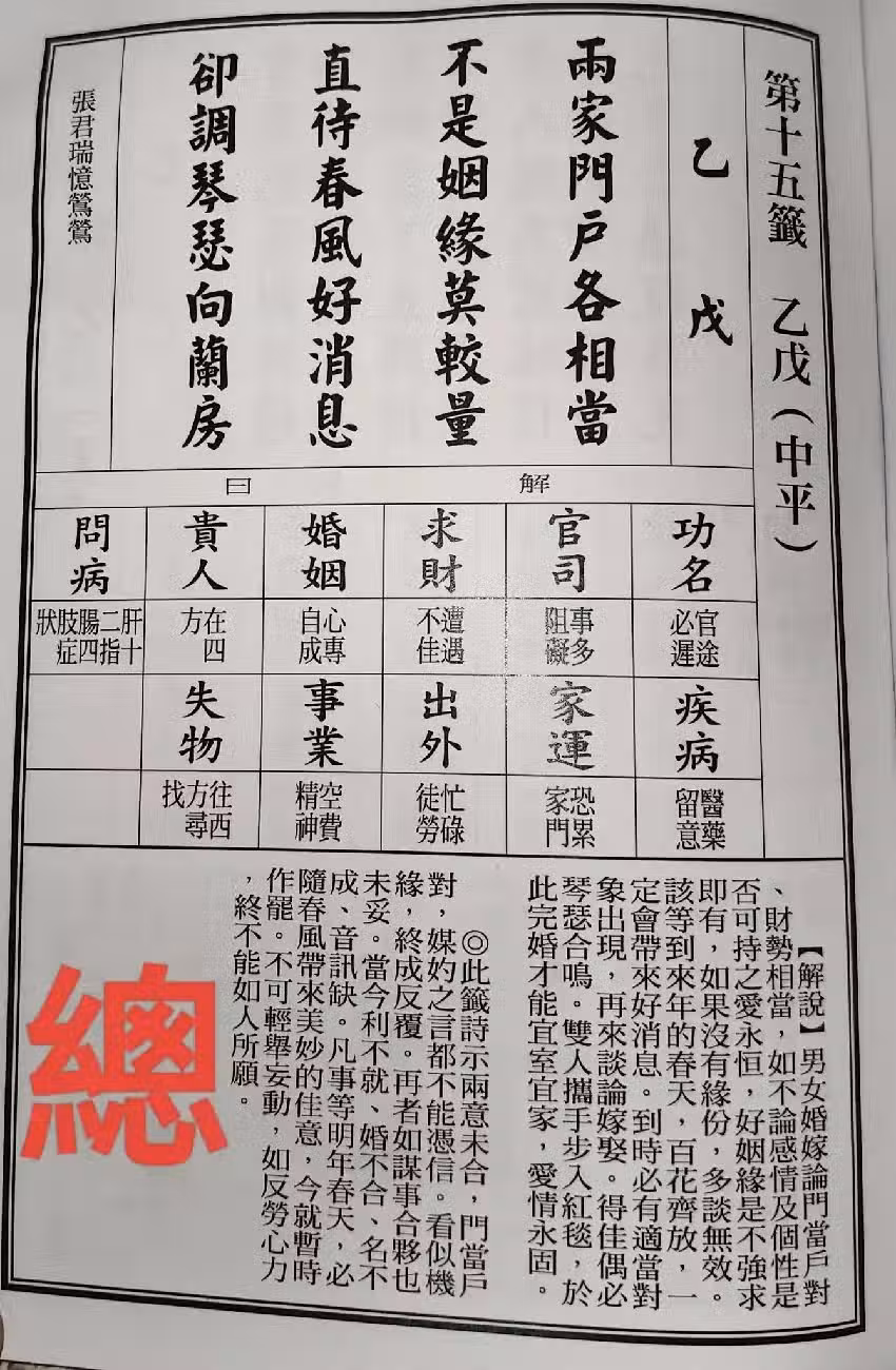 臉書粉專「宮廟小編阿樺」解簽,表示這首籤詩暗示兩股勢力實力相當,彼此對立而無法融合。