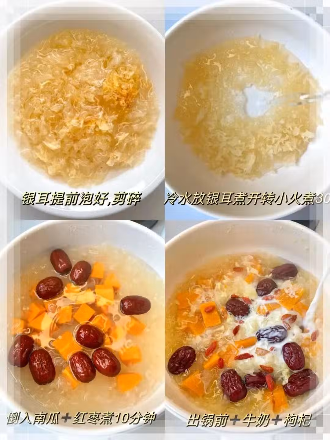 • 大火煮開後轉小火,慢燉30分鐘,直到銀耳變得軟糯。