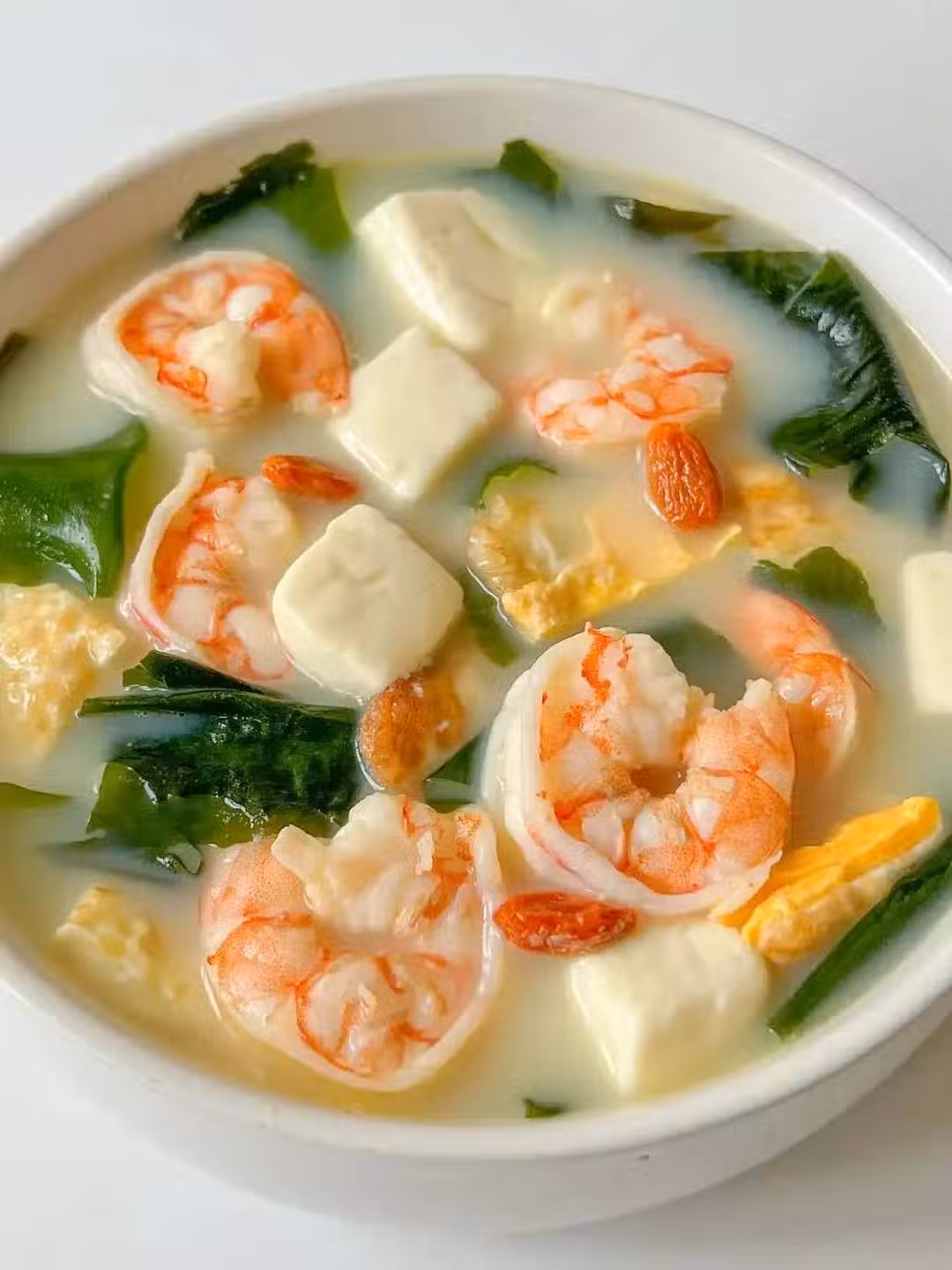 【材料】:裙帶菜,嫩豆腐,鮮蝦,枸杞,雞蛋,裙帶菜提前泡發好,鮮蝦處理好,用薑片去下腥
