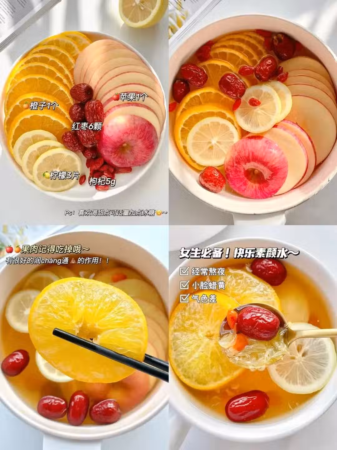 ✅食材:蘋果1個、橙子1個、檸檬3片、紅棗6個、枸杞 5g