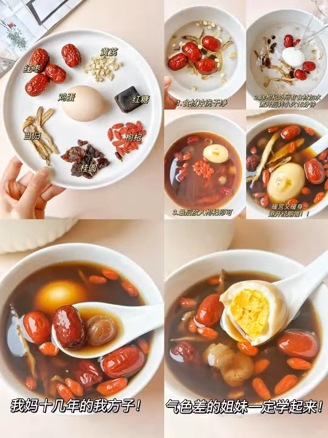 2️⃣千古名方四物湯 食材:當歸9g、白芍9g、川芎6g、熟地黃12g、紅棗4顆,熟雞蛋2個 ………………… …………………
