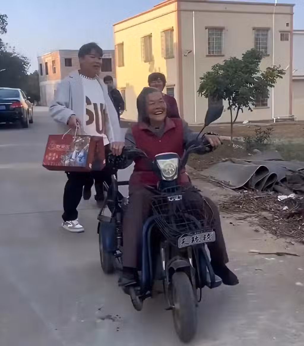 全紅嬋戴墨鏡拎禮物回家,與外孫放鞭炮過新年