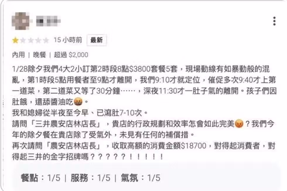 點開「三井日式料理」的評論可以看到,近期有多筆一星評論,內容都是提及除夕夜的亂象,包括系統故障導致現場大亂,宛如薑母鴨餐廳,等了半小時才入座「所有人都在門口吹冷風。