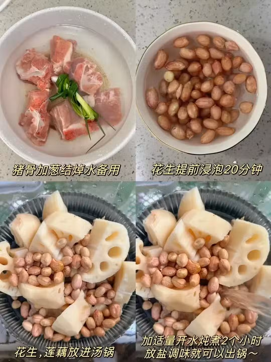①.將蓮藕用清水洗乾淨切塊,花生用溫水提前浸泡20分鐘