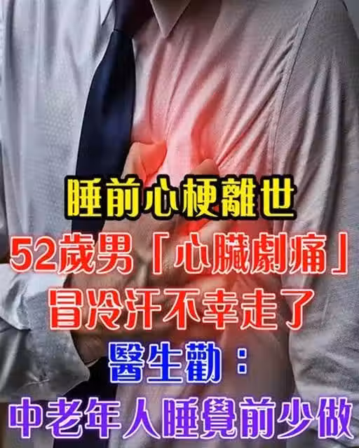 睡前心梗離世 52歲男「心臟劇痛」冒冷汗不幸走了 醫生勸:中老年人睡覺前少做…