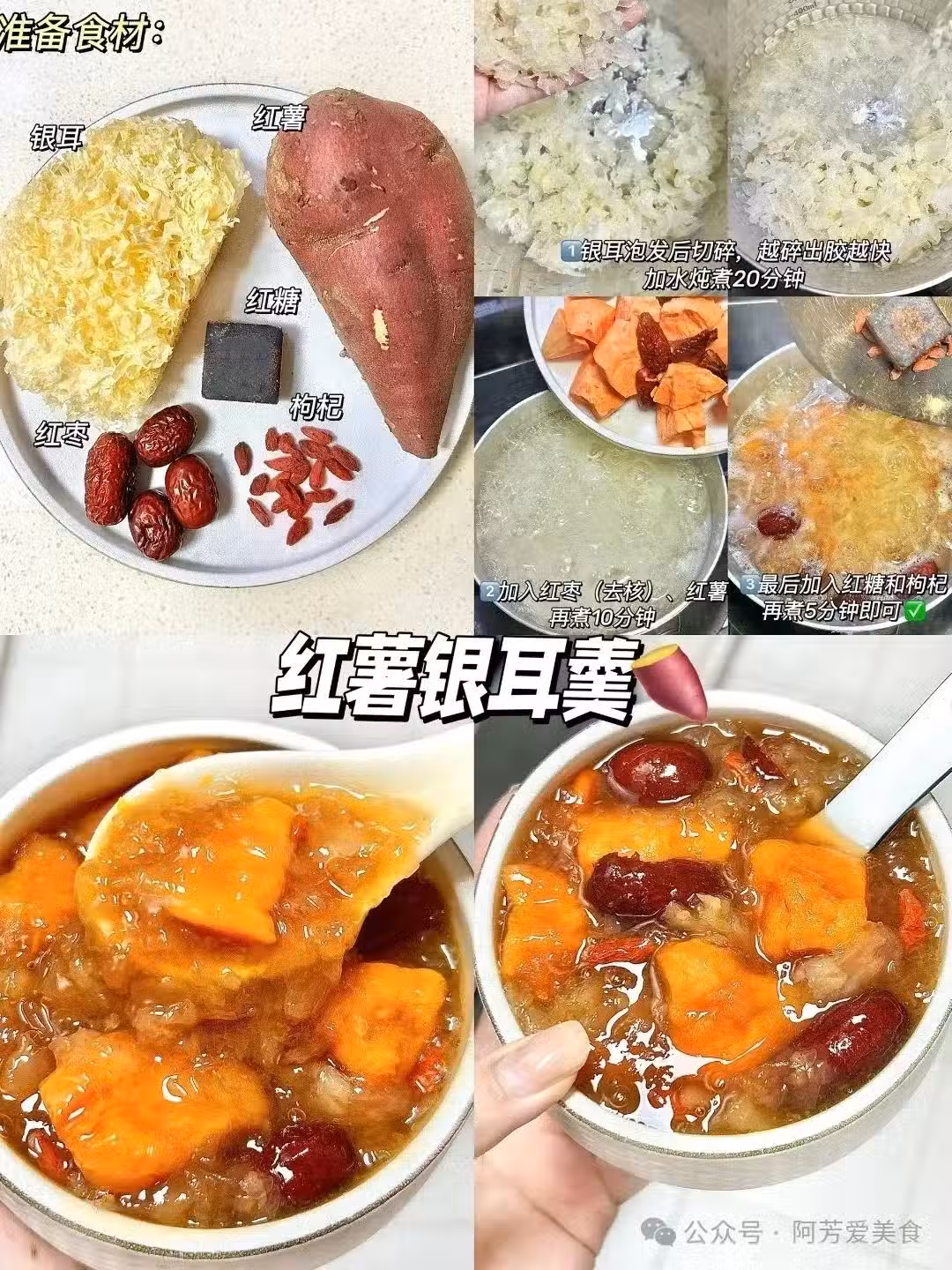 紅薯銀耳羹,紅薯和銀耳的搭配簡直是非常的巧妙,好喝又解膩,紅薯和銀耳都是非常的軟糯香甜的,再加入紅棗甜味更加的濃郁,要記得去核哦更加入味!