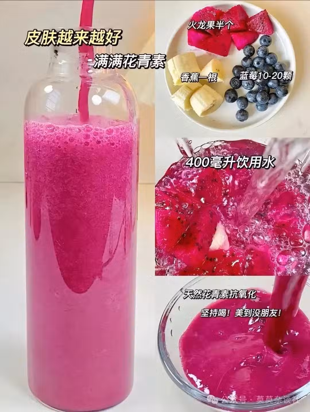 味道與功效:粉粉嫩嫩的顏色,味道酸甜可口。火龍果和香蕉富含膳食纖維,藍莓則是抗氧化和護眼的高手,春節吃多了的「大肚腩」靠它來解決!