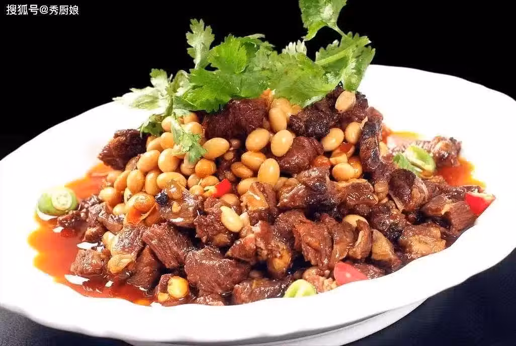 4.加入軟化的黃豆,繼續燉煮10分鐘,使黃豆與牛肉的味道融合,根據個人口味,加入適量的鹽和白鬍椒粉,調味均勻,繼續燉煮5分鐘,使調味料滲入牛肉和黃豆中,關火,將黃豆燒牛肉裝盤,即可享用。