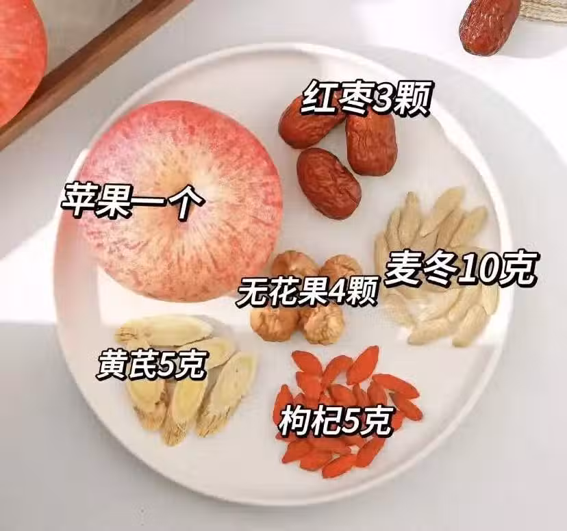 蘋果1個、黃芪5g、無花果4顆、紅棗3顆、麥冬10克、枸杞5克