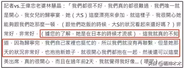 此前就有導遊爆料大S落地日本當天就有不舒服,明顯症狀是咳嗽伴有哮喘,這聽起來就像是冬季感冒的樣子。而就在年前她還出席王偉忠家的宴會,王偉忠老婆接受採訪還透露大S宴會當天狀態非常好,打扮漂亮,互相還抱抱。