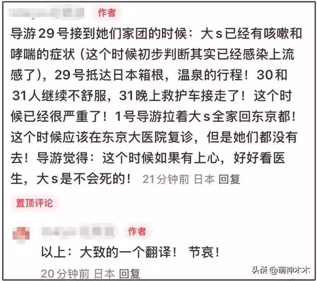 大S就這樣帶病陪著家人玩樂,她本人可能沒當回事,而枕邊人具俊曄似乎也沒在意,直到31號晚上,大S病情嚴重到叫救護車,次日(1號)導遊拉著全家到東京都,這時候其實應該去大醫院看看的,雖說有在日本的網友稱日本看病流程繁瑣,但大S一家都是明星,如果真的想看病,怎麼也會比普通人容易,但她們卻都沒有去,最後1號半夜又叫了救護車,到了醫院,2號早上就去世了。