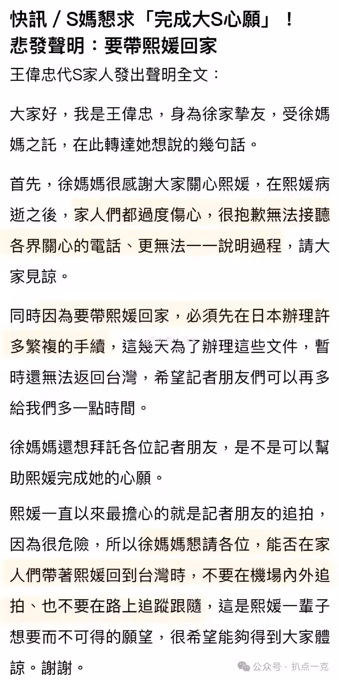 對於網友怒斥徐家不關心大S身體的言論,S媽表示,大S在出發前就已經有感冒和哮喘的症狀了,為了不掃興還是正常出發了,到日本第三天被送去急診,第五天晚上因病離世。