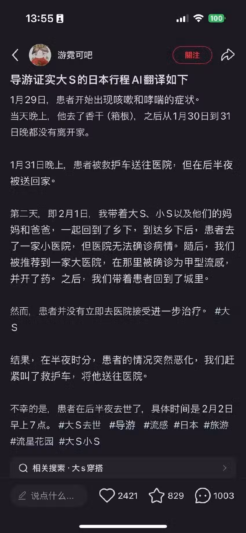 31日晚間大S病情加劇,緊急送醫後返回旅館。