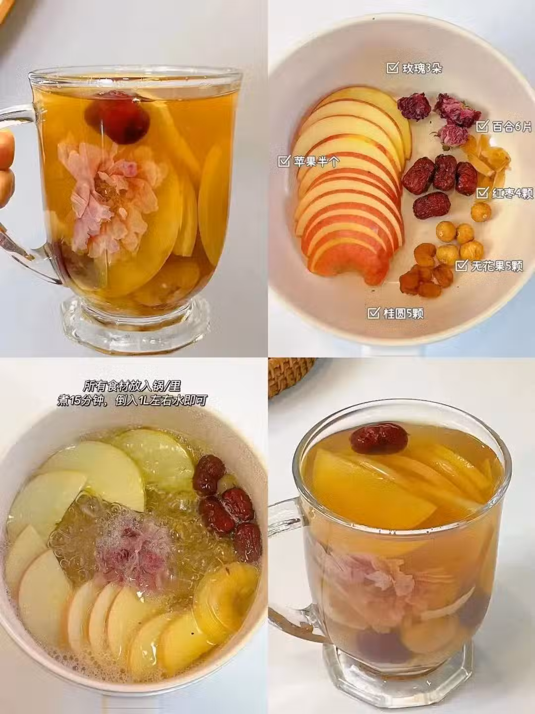 ④蘋果雪梨桂圓水:冬天真的乾燥無比,多喝這個蘋果雪梨桂圓水就對了,因為蘋果和雪梨富含膳食纖維和維生素,搭配上健脾清熱的無花果,安心養神的百合,還有補血養氣的紅棗和桂圓,這些搭配煮水,不僅味道清甜好喝,而且可以補氣補血,滋潤皮膚,還可以滋陰潤燥,養心安神,很適合脾胃虛弱,口乾舌燥,皮膚乾燥,口臭,容易上火的人多喝~