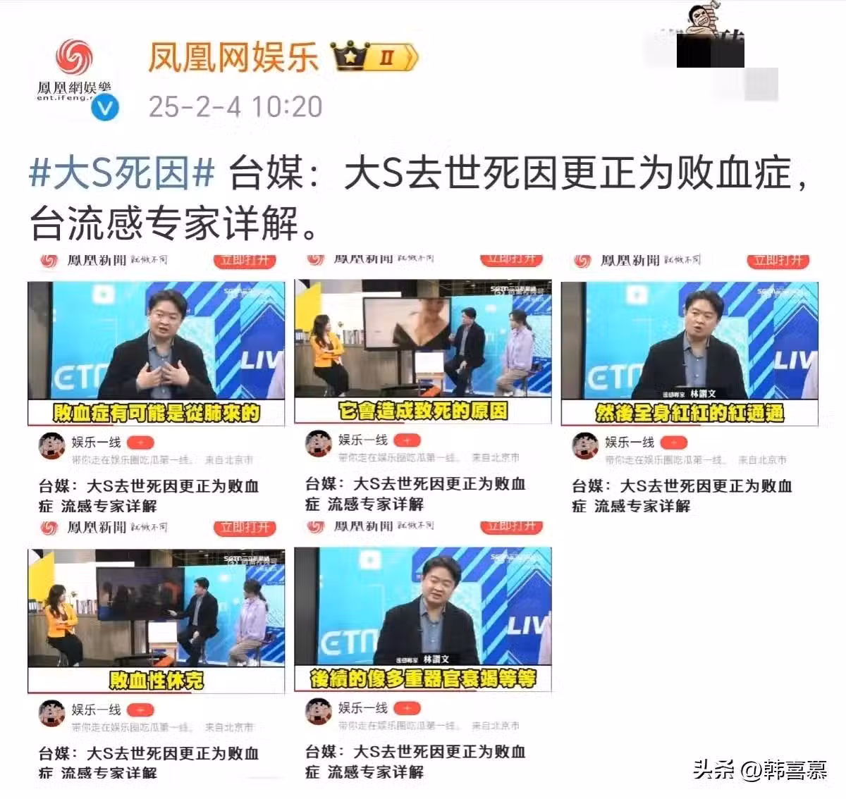 台灣專家稱,大S在日本確實是得了流感,而且還有並發肺炎,但導致她的死因是敗血症。當然這只是台灣專家的一種解讀,主流媒體都認為大S是流感並發肺炎去世的。