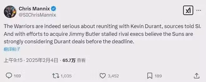 2月4日上午,據體育畫報記者Chris Mannix報道,太陽在認真考慮交易杜蘭特。上周勇士報價杜蘭特,但是被太陽拒絕。當時太陽想用比爾換來巴特勒,可惜比爾不願放棄交易否決權,巴特勒交易一拖再拖,太陽失去耐心。