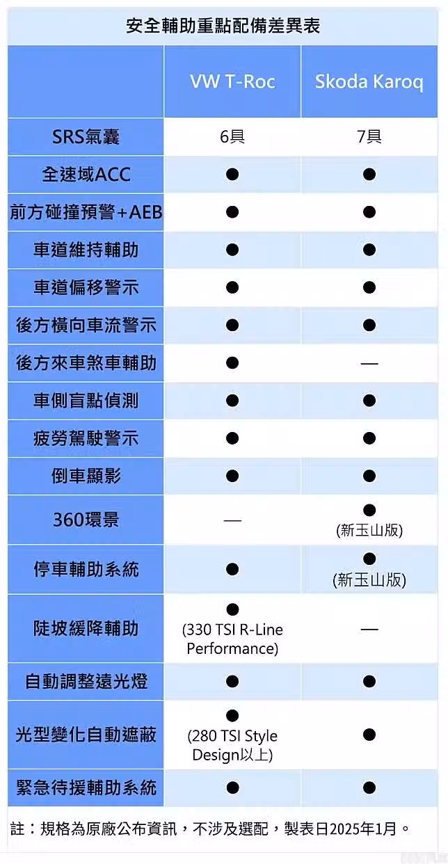 兩款小休旅皆有完整的Level 2駕駛輔助,全速域ACC、車道維持輔助、前方碰撞預警剎車、盲點偵測、後方交通警示樣樣不缺,不過細看兩者還是有別,T-Roc多了後方橫向車流剎車輔助,安全防護更全面,且標配主動停車輔助,即使入門款也能享受方便的科技配備;至於Karoq贏在Martix LED智慧頭燈列標配,還有對手沒有的360度環景,日常用車的實用性更加分。