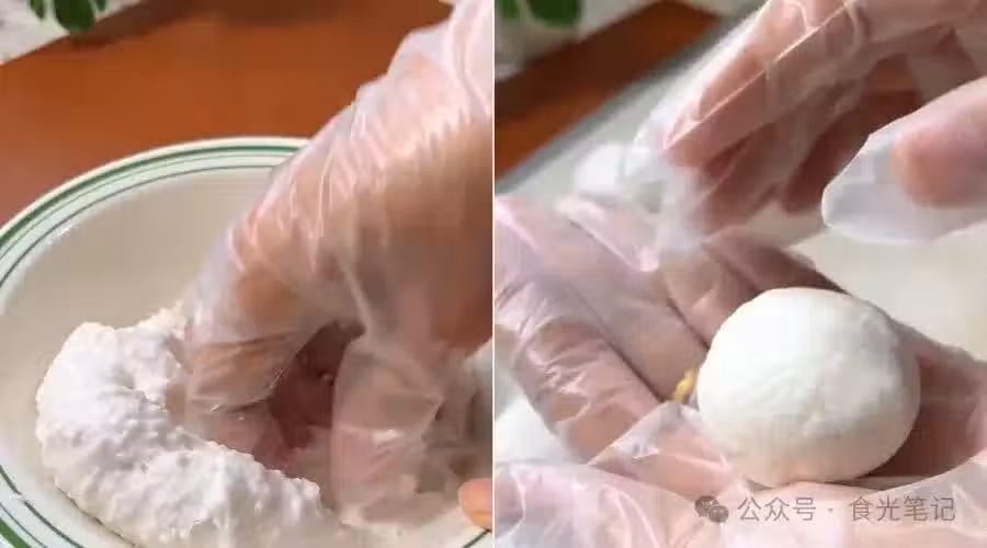將搓好的紫薯圓球放在餅皮中間,像包餃子一樣將餅皮對摺,捏緊收口,再搓圓一點。如果家裡有漂亮的模具,那就更好了。在餅皮上裹上一層玉米澱粉,用模具壓出花形。這樣蒸出來的水晶糕既美觀又美味。