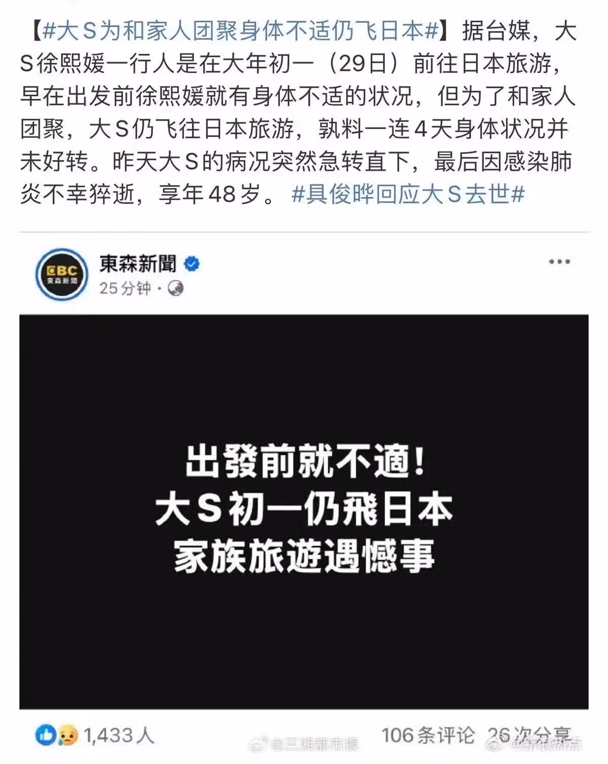 大S屬於是全程帶著病和家人吃吃喝喝玩玩,中間還被診斷為甲流,但家人完全沒重視,還帶著她走接下來的行程,以及泡溫泉。
