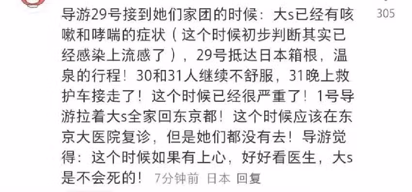 另外,也有帶領大S全家去日本的導遊發聲,稱大S早在前往日本的時候身體就已經出現狀況,到達日本才玩了沒多久,當天晚上就前去醫院看病,不過醫生只給她開了一些藥物服用。