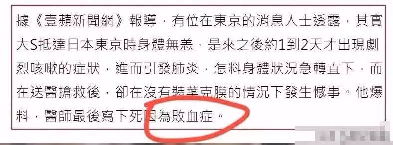 知情人透露,大S真正的死因,其實是敗血症,她的病情發展很快,醫生甚至沒來得及為她裝葉克膜就已無力回天。