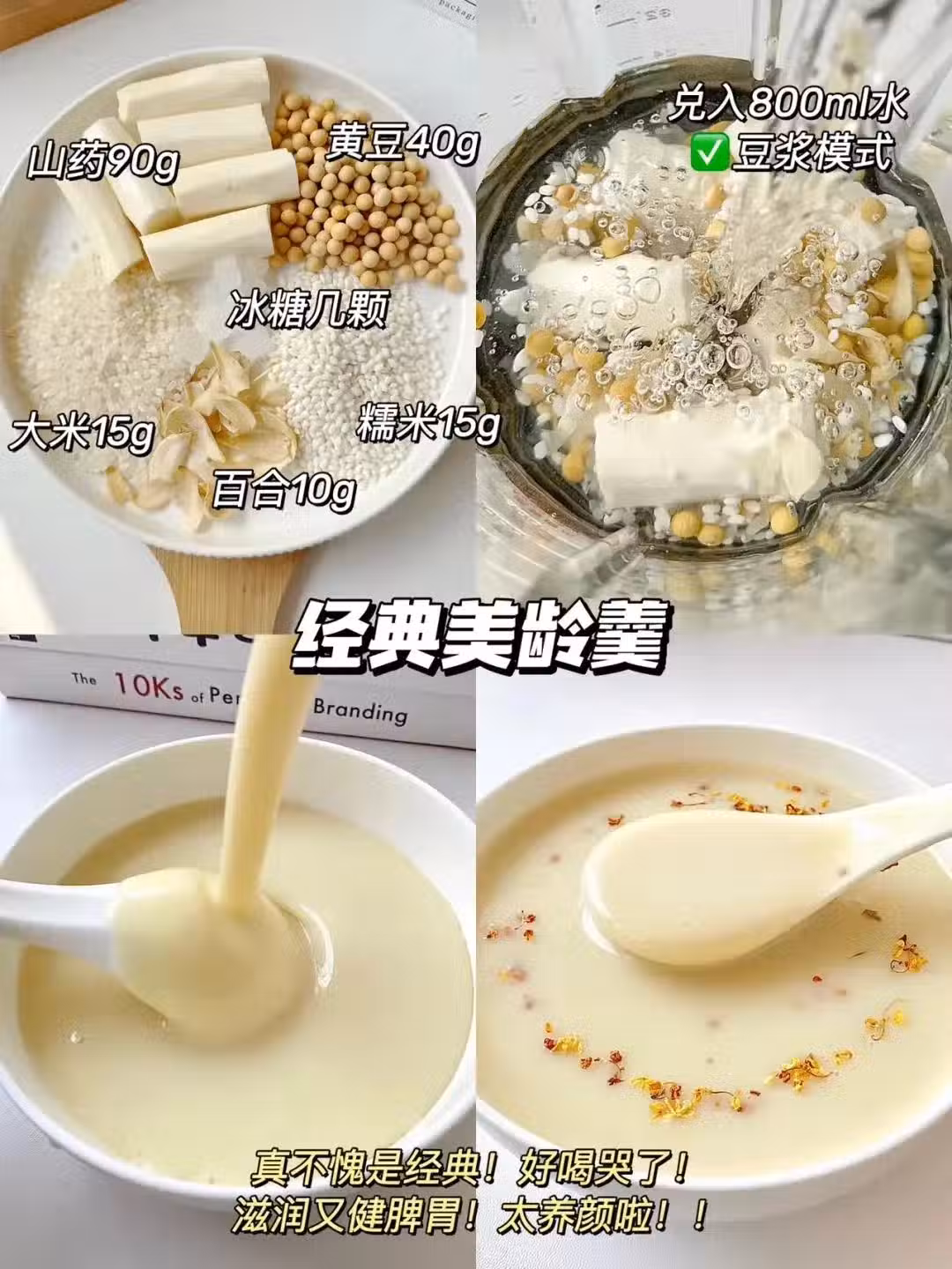 美齡羹真不愧是經典!好喝哭了,黃豆、山藥、百合,每種食材對女生都很友好!湊一起滋補加倍!不僅養顏潤燥,還健脾胃! 2️⃣水潤五白羹 ☑️食材:銀耳1朵、杏仁10g、雪梨半個、冰糖2顆、百合10g、山藥3節