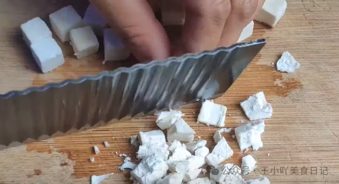 3.處理茯苓:將浸泡好的茯苓從水中撈出,放在案板上。由於茯苓質地堅硬,為了便於其營養成分的釋放,我們需要將其切成小塊。切好後,直接放入鍋中,為接下來的煮製做好準備。