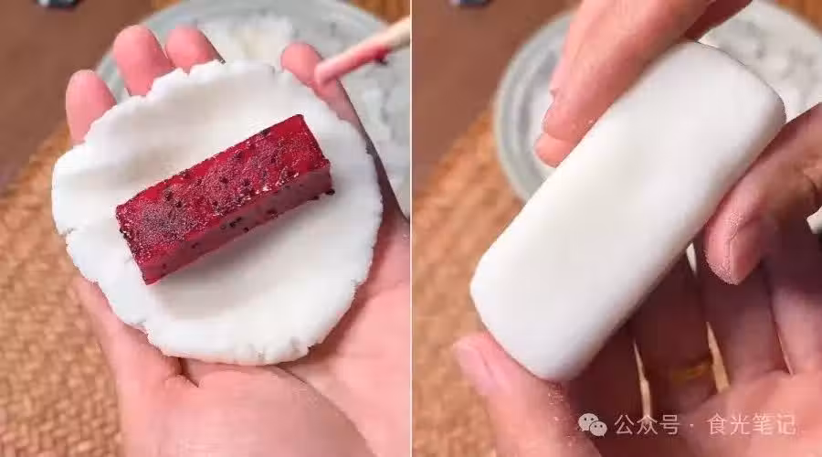 包好的山藥火龍果球,放在椰蓉里滾一滾,讓外面均勻地裹上一層椰蓉。這樣的水果山藥膏就做好啦!