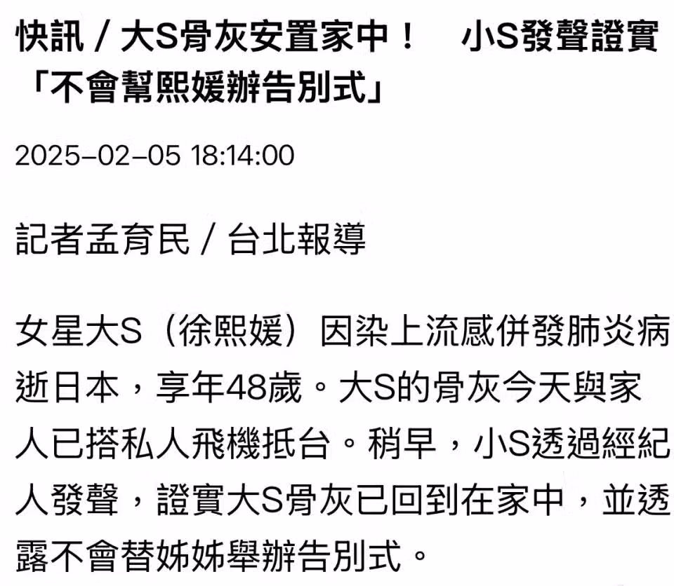 2月5日,大S的骨灰由私人包機運回台北,由VIP通道離開,一部分在機場守候的媒體直接撲空了。大S的骨灰並沒有送到此前所傳的龍岩民權會館,而是直接回到家中。