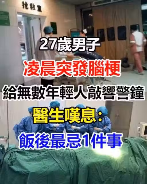 27歲男子凌晨突發腦梗!2小時後離世「給無數年輕人敲響警鐘」 醫生嘆息:飯後最忌1件事 ❗