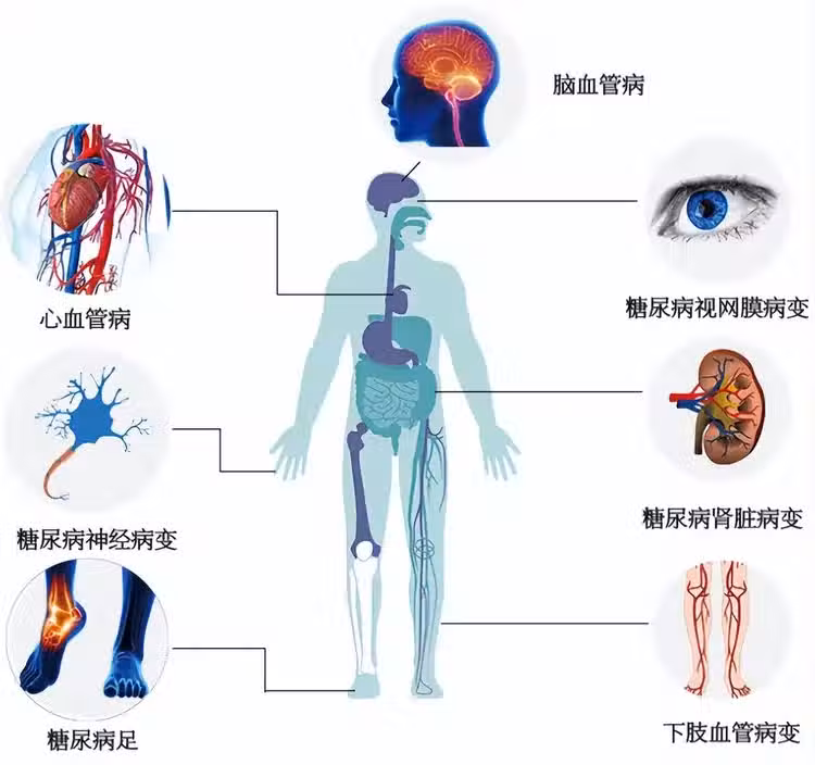 糖尿病的慢性併發症是導致糖尿病病人致殘、致死的首要因素。主要包括大血管、微血管的病變,神經的病變以及糖尿病足。其中約有80%糖尿病病人會因大血管病變如心臟、大腦中重要血管的病變而失去生命。糖尿病微血管病變中視網膜的病變已成成為成年人致盲的首要原因。
