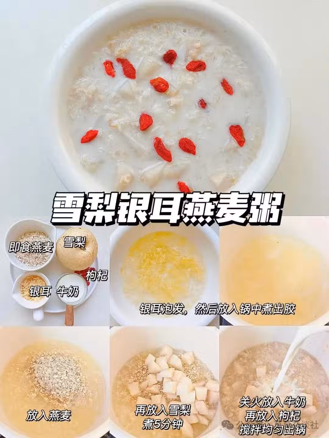 食材:燕麥片40g | 銀耳10g | 雪梨1個 | 牛奶200ml