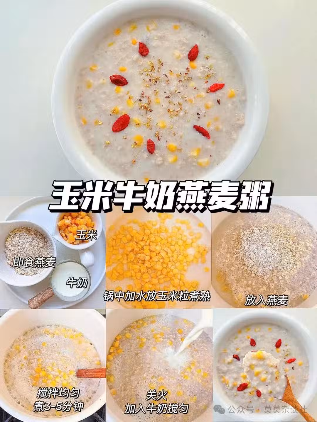 食材:燕麥片40g | 玉米粒80g | 牛奶200ml | 鹽或糖適量