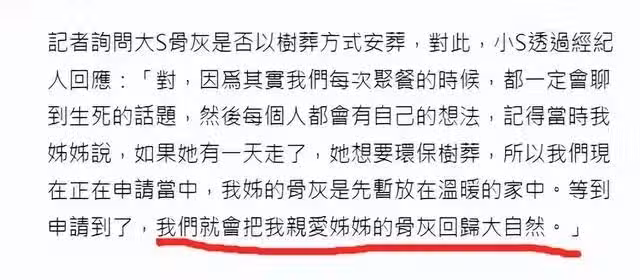 據小S方面證實,大S的骨灰將會擇日移出豪宅,目前親屬們正在申請為大S以樹葬的方式安葬。如此一來,也算是徹底可以讓大S的骨灰能夠回歸大自然。