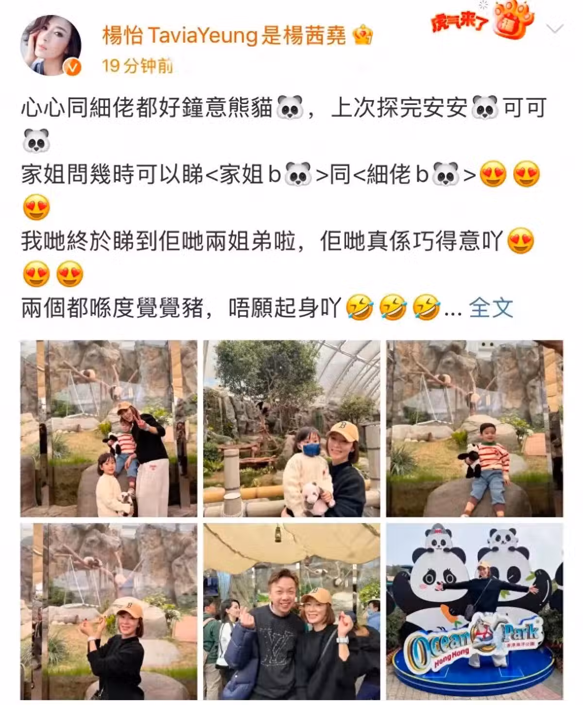 2月9日,楊怡(楊茜堯)在社交平台曬出帶著一雙兒女去海洋公園看雙胞胎大熊貓的照片,母子三人好歡樂。-