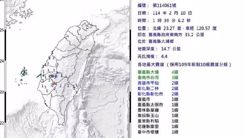 嘉義縣大埔鄉今日凌晨發生芮氏規模4.4地震。