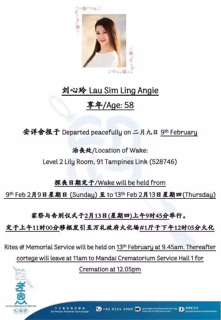 新加坡歌台藝人劉心玲星期天(2月9日)逝世,終年58歲。